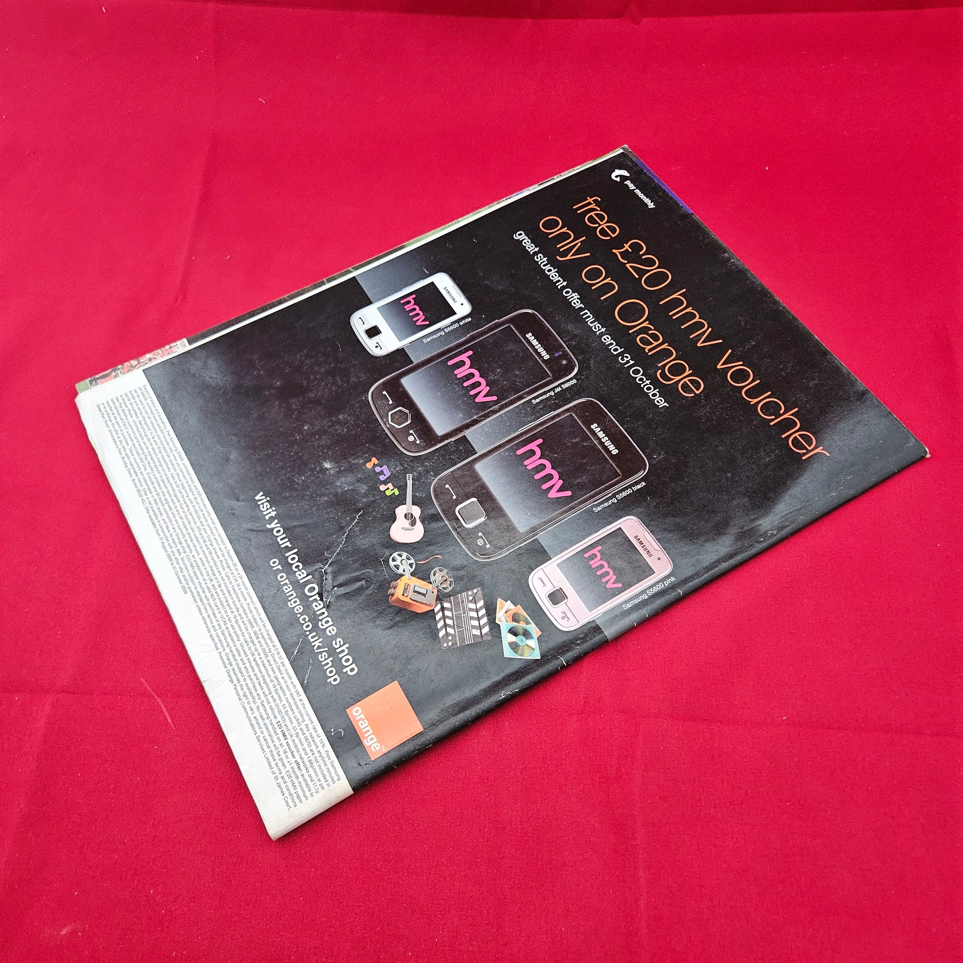 Vintage Advertising: The back cover features a classic Y2K tech ad for Orange mobile and HMV, featuring the Samsung S5600.